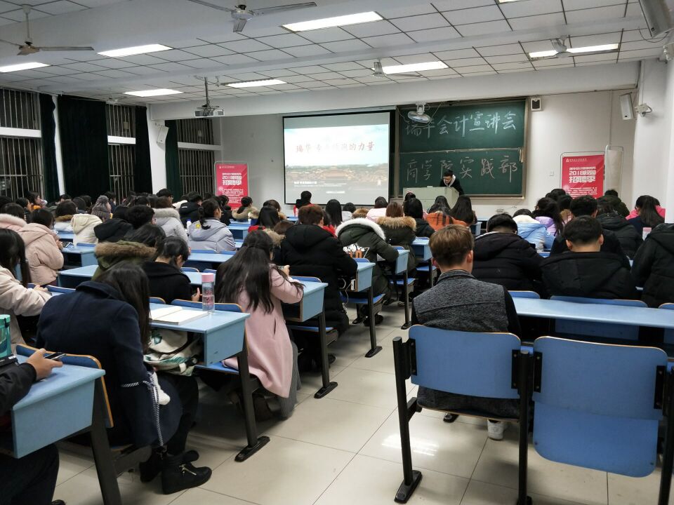于12月29日晚上7点在东校区教南108举办了瑞华会计事务所宣讲会。本次宣讲会特别邀请了瑞华校园大使许啸同学作相关介绍,通过专人讲解,视频展现,歌曲文化感染等方面向同学们形象地展现了瑞华会计师事务所的文化背景,应聘要求以及事务所在国内及全球的相关情况。