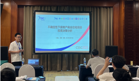 研究生黄河,在管理决策与支持系统分会场,进行了《不确定性下房地产住宅项目投资决策分析》论文汇报,围绕在货币时间价值理论以及投资组合理论的基础之上,基于房地产开发项目资金流动的现实情况,构建住宅项目投资决策的模型。进而,以累积现金流最大化为目标,资金持续循环为约束条件,构建了单目标非线性混合整数模型,并将销售收入波动作为风险指标引入模型,为房企优化项目投资决策提供决策参考。在场的参会专家及学者进行了点评,并提出了修改建议。