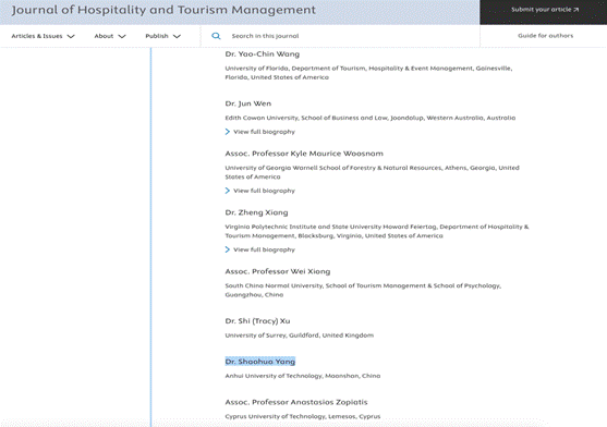 JHTM本届编委会成员全球共82位专家,其中来自中国大陆地区的仅2位,杨少华是其中之一,表明其在旅游与酒店管理学领域的研究成果具备了较高的国际影响力,获得了国内外相关领域专家的认可。
