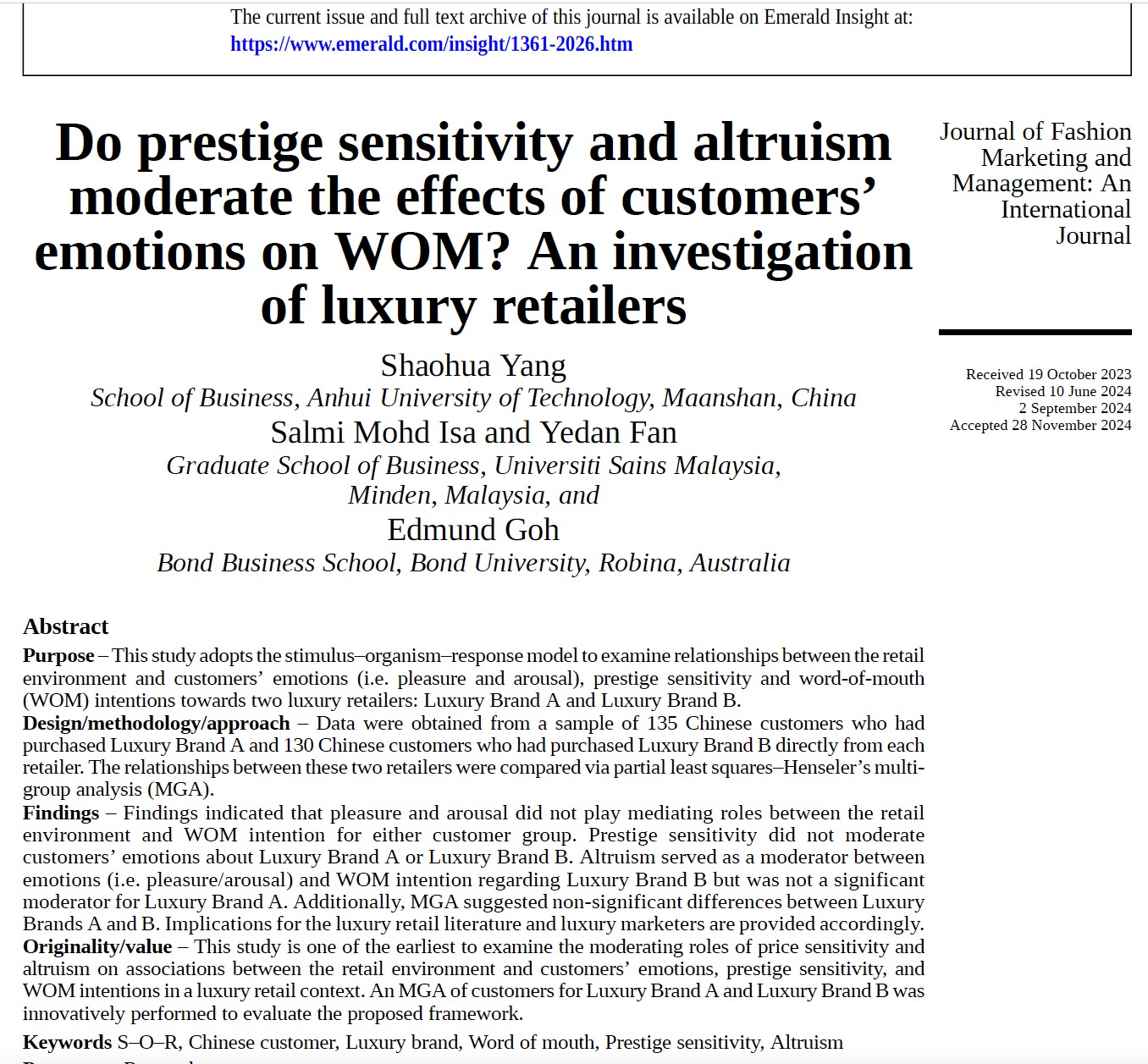 杨少华副教授以第一作者身份在国际知名期刊《Journal of Fashion Marketing and Management》(简称JFMM,中文名《时尚营销与管理杂志》)上发表了一篇题为《Do prestige sensitivity and altruism moderate the effects of customers’ emotions on WOM? An investigation of luxury retailers》的学术论文。合作作者包括马来西亚理科大学的樊烨丹博士和澳大利亚邦德大学的Edmund Goh教授,正妹av