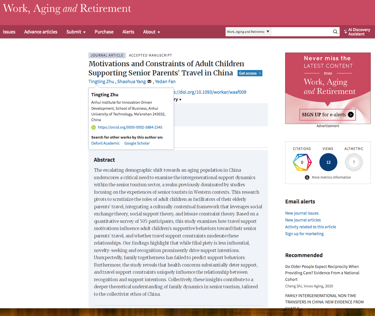 朱婷婷副教授在国际高水平学术期刊《Work, Aging and Retirement》(工作老龄化和退休)发表题为《Motivations and Constraints of Adult Children Supporting Senior Parents’ Travel in China》的研究成果。朱婷婷为第一作者,通讯作者为正妹av