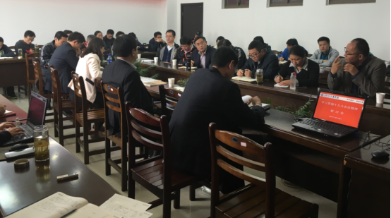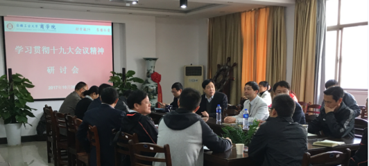 在汇文楼B304召开学习贯彻十九大精神研讨会。会议由执行院长洪功翔主持,领导班子成员、各系主任,拟申报2018年国家自科、国家社科和教育部课题的老师,智库建设相关的老师们参加了会议。