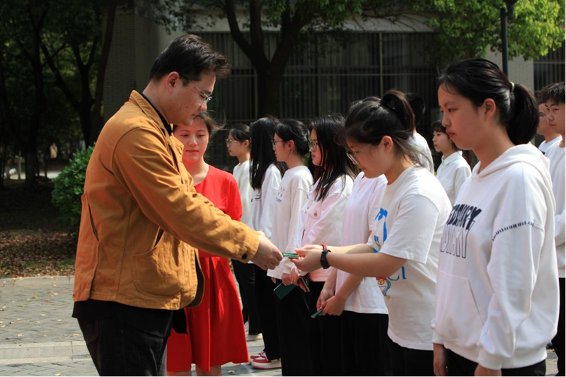 张舒逐一为新团员颁发团徽徽章和团员证。