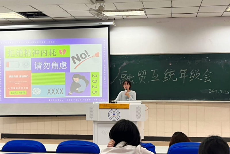 在东校区阶梯教室102举办 “破内耗阴霾,筑心灵绿洲” 主题年级会。此次会议由辅导员肖梦雨主讲,2023级全体同学参加。