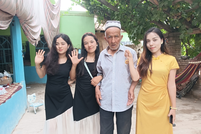 在新疆喀什市伯什克然木乡依恰村,94岁退休老党员卡德尔·克热木与实践队队员深度交流。18岁入党、党龄57年的他,曾获“在党50年”荣誉勋章,从十户长到村支书,始终以“为人民服务”为宗旨兢兢业业。